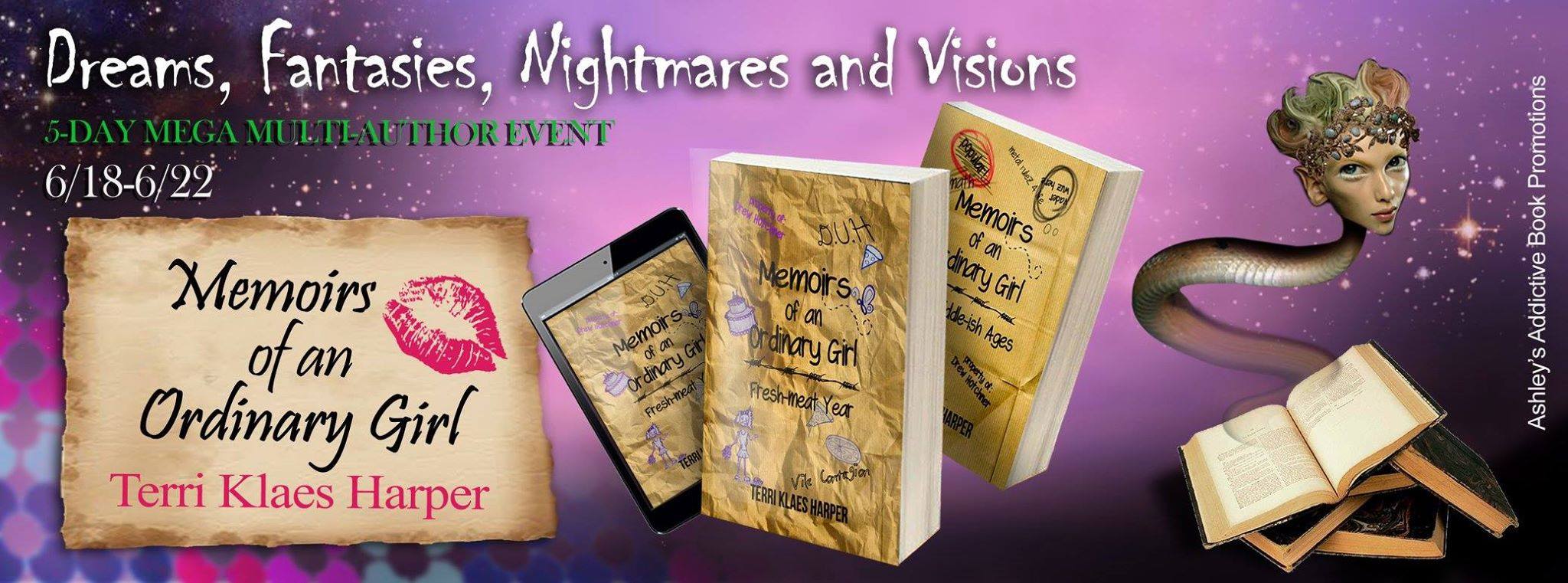We should be quite the mix of authors for this 5 day mega multi-author event. Come check us out afternoons/evenings from June 18-22. Also, enter our giveaway.  So many prizes!